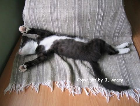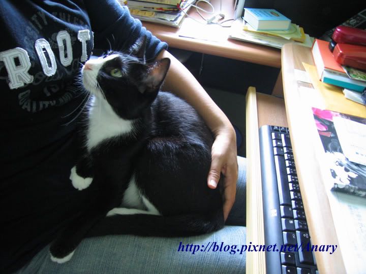 「我馬麻這個月落在水深火熱的趕稿地獄裡,她每天早上起床後就是工作工作工作,一直到晚上上床睡覺為止。她以前是三個月翻譯一本十來萬字的書,但現在得在一個月內完成。她忙到一個地步,除了清貓砂放貓飯,其餘她一概不理。當然啦,Leggy追殺我時會逼她起來運動一下追殺Leggy,但那是在我哀得很大聲很悽慘的時候她才會聽見。不過,當我對她開的罐頭口味不滿意不吃時,她不像以前會慢慢哄我,而是會擺著就讓Leggy去吃。真可恨,馬麻這麼沒耐心都是棒棒冰跟花癡女害的,我也想砍死他們!報告完畢。」(看我多麼用心良苦,得把腳放在鍵盤上才能引起注意。)