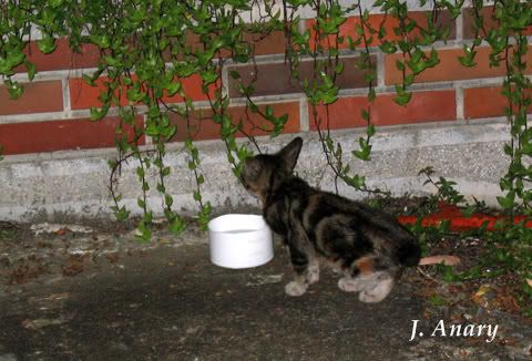 她們母女三個,每次食物放下之後,都是這隻小三花搶先過去吃。小三花吃夠了,才換她姊姊小白襪過去吃,然後等她們都吃飽了,貓媽媽才會去吃剩下的。貓媽媽很疼她們,總是守護得緊緊的,每次我只要稍稍微靠近一點,就會很兇地哈我。
