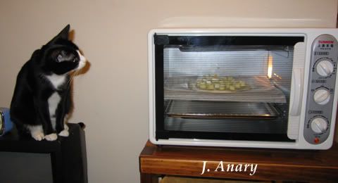 當我在做準備工作以及揉麵團時,想也知道,兩個小傢伙一點也沒閒著。不是坐在流理台上我手邊,就是在流理台上走來走去,並且拼命要把鼻子伸到盆裡來嗅麵團。我得一邊揉麵一邊擋著他們,尤其是Leggy,他一副興致勃勃也很想幫我忙的樣子。也許下次我可以考慮把他的手洗乾淨,然後拿來在麵團上蓋幾個貓爪印。